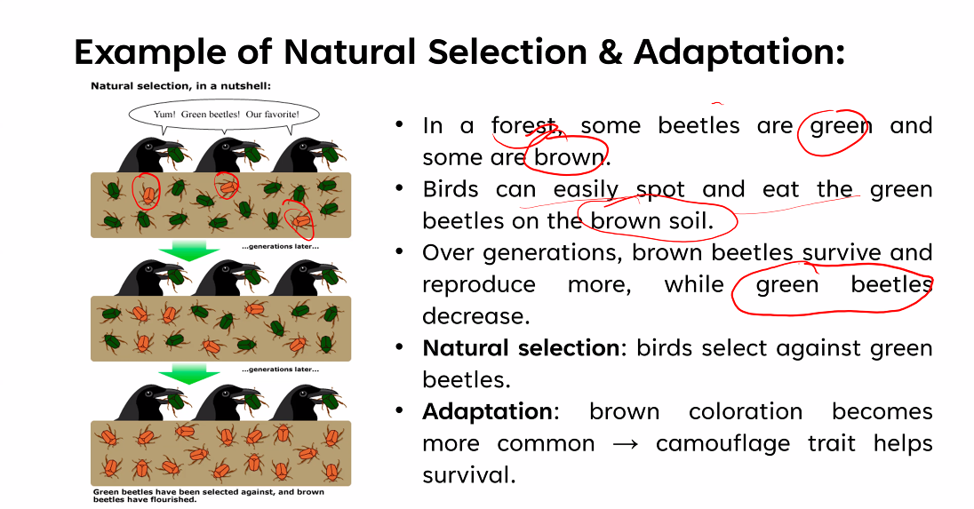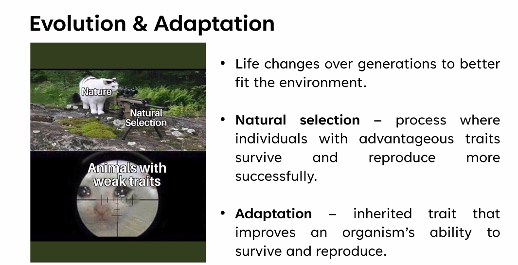 Adaptation: Inherited traits improves and organisms ability to survive and reproduce.