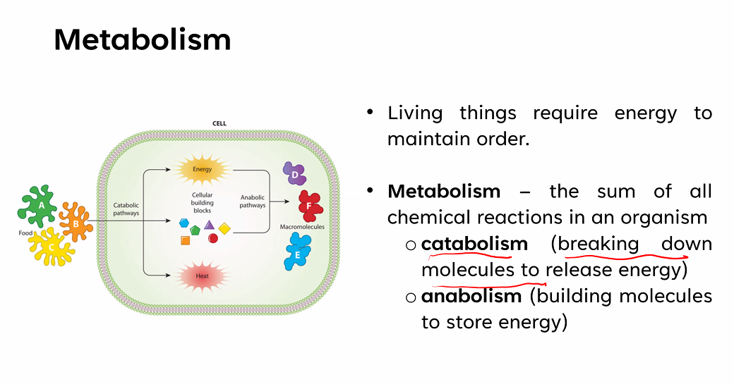 Metabolism, the sum of all chemical reactions in an organism.